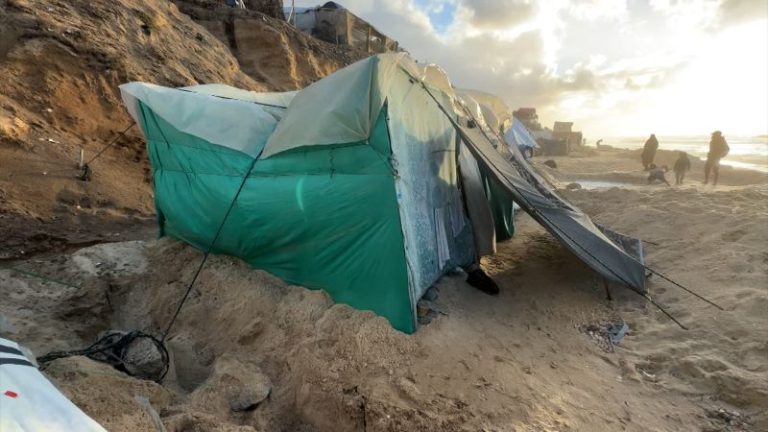 In a makeshift displacement camp near the sea in Deir al-Balah, central Gaza, thousands of families battled high tides, heavy winds and rainfall that damaged their nylon and plastic tents.